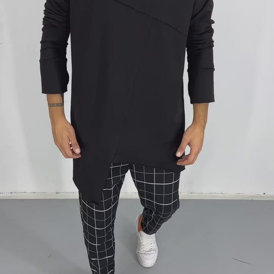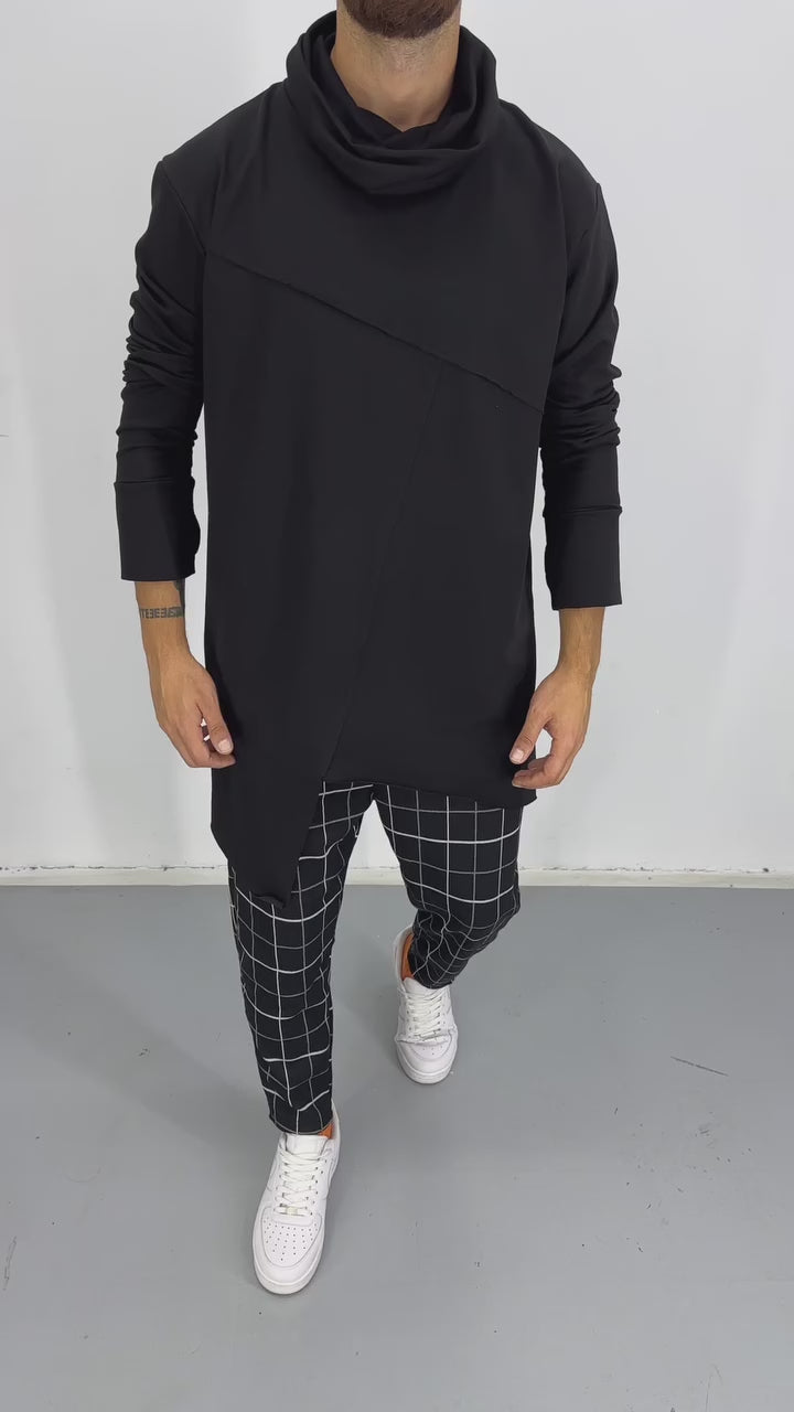 Bluză neagră, cu croială modernă și lejeră, realizată din material moale și confortabil. Modelul are un guler tip funnel care adaugă un aspect urban și minimalist. Linie diagonală decorativă pe partea frontală, conferind un detaliu asimetric subtil. Mâneci lungi, cu tivuri late, și un croi ușor prelungit, asimetric, în partea de jos. Stil versatil, ideal pentru ținute casual sau streetwear.